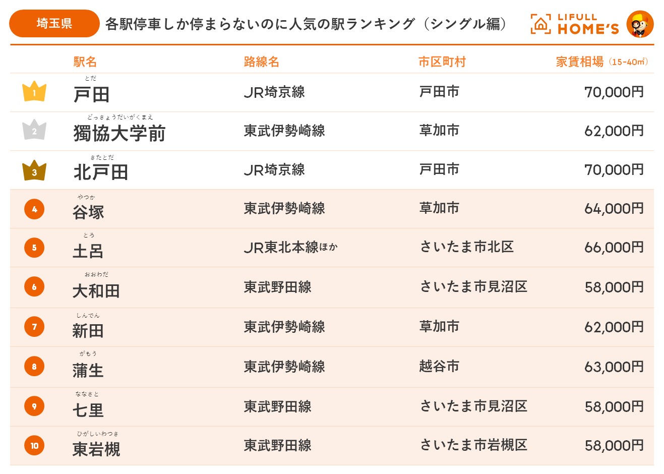 埼玉県編は1位「戸田」、2位「獨協大学前」、3位「北戸田」となり、交通利便性と生活利便性の双方を兼ね備えた駅が並んだ。