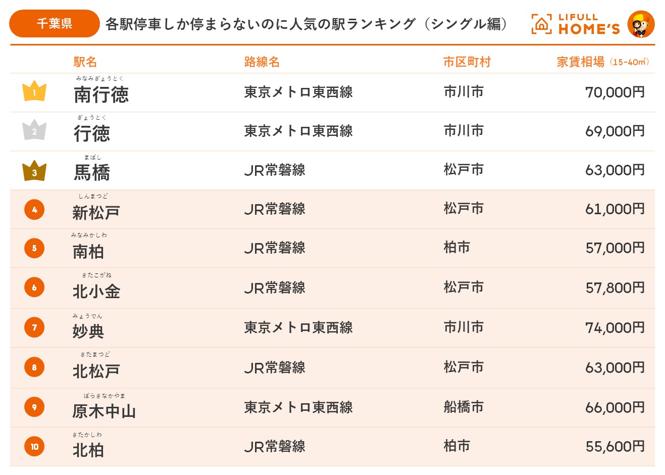 千葉県編は1位「南行徳」、2位「行徳」、3位「馬橋」となり、トップ10には東京メトロ東西線とJR常磐線上の駅が並んだ。
