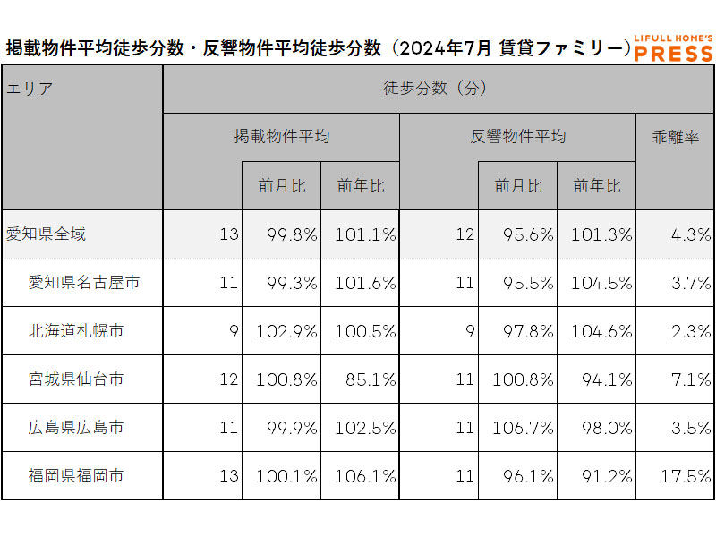 2024年7月の愛知県および地方4市(札幌市、仙台市、広島市、福岡市)のファミリー向き賃貸物件の掲載物件平均徒歩分数および反響物件平均徒歩分数は以下の通り。