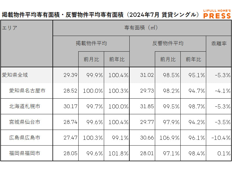 2024年7月の愛知県および地方4市(札幌市、仙台市、広島市、福岡市)のシングル向き賃貸物件の掲載物件平均専有面積および反響物件平均専有面積は以下の通り。