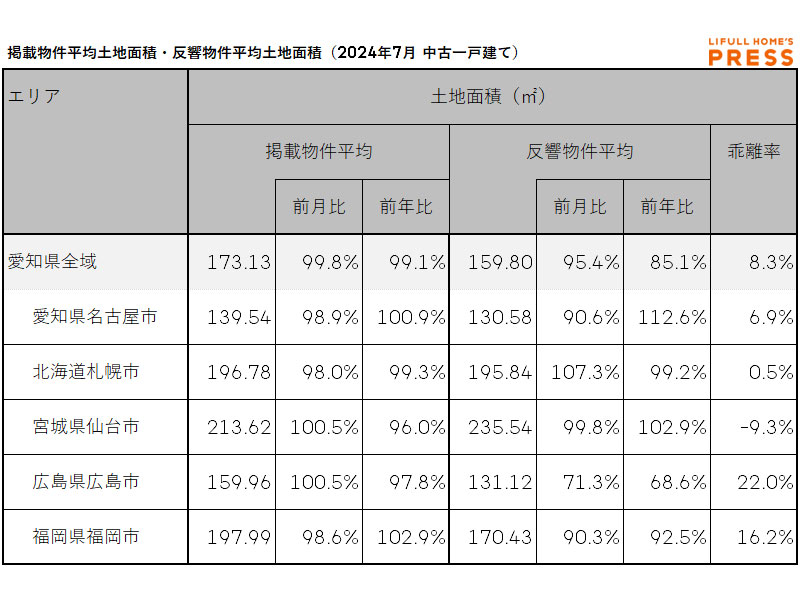 2024年7月の愛知県および地方4市(札幌市、仙台市、広島市、福岡市)の中古一戸建ての掲載物件土地建物面積および反響物件平均土地面積は以下の通り。