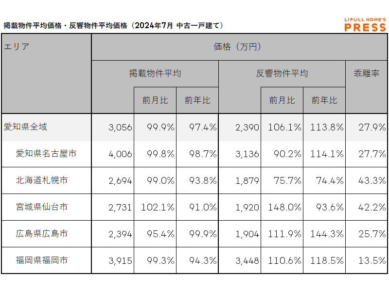 2024年7月の愛知県および地方4市(札幌市、仙台市、広島市、福岡市)の中古一戸建ての掲載物件平均価格および反響物件平均価格は以下の通り。