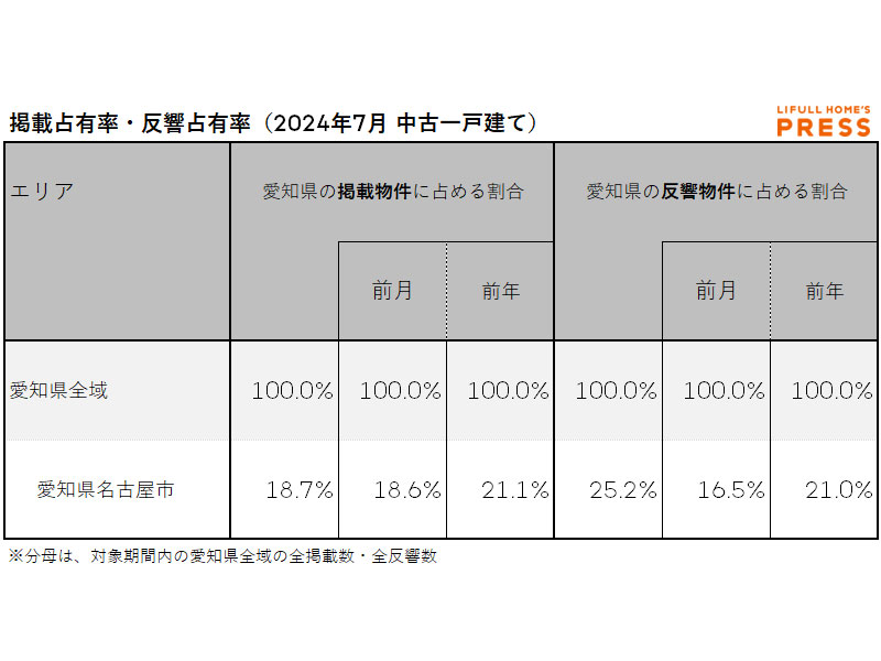 2024年7月の愛知県の中古一戸建て市場における、各エリアの掲載占有率および反響占有率は以下の通り。