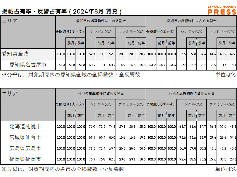 2024年8月の愛知県および地方4市(札幌市、仙台市、広島市、福岡市)賃貸物件市場における、各エリアの掲載占有率および反響占有率は以下の通り。