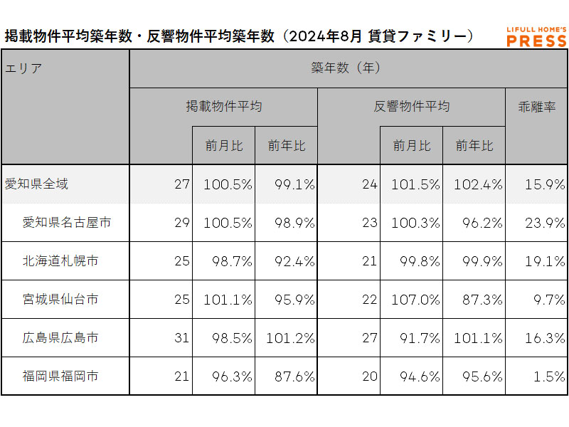 2024年8月の愛知県および地方4市(札幌市、仙台市、広島市、福岡市)のファミリー向き賃貸物件の掲載物件平均築年数および反響物件平均築年数は以下の通り。