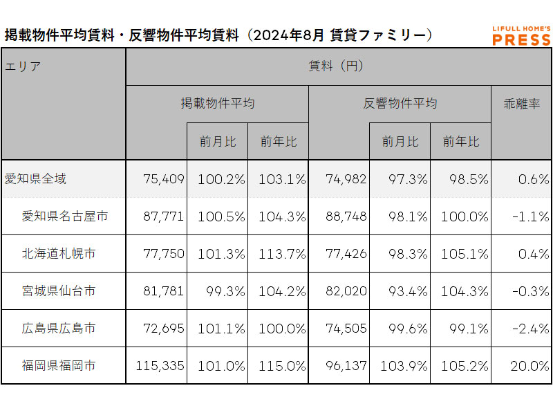 2024年8月の愛知県および地方4市(札幌市、仙台市、広島市、福岡市)のファミリー向き賃貸物件の掲載物件平均賃料および反響物件平均賃料は以下の通り。