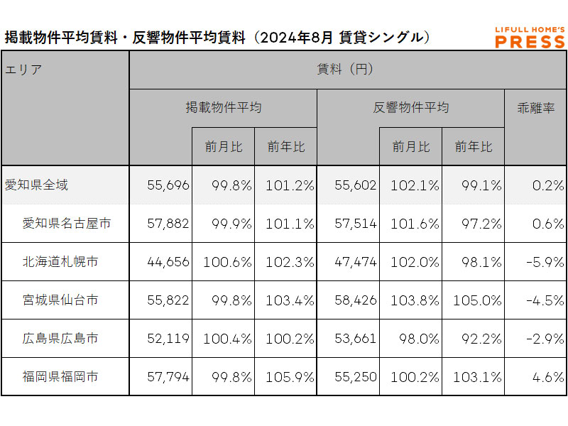 2024年8月の愛知県および地方4市(札幌市、仙台市、広島市、福岡市)のシングル向き賃貸物件の掲載物件平均賃料および反響物件平均賃料は以下の通り。