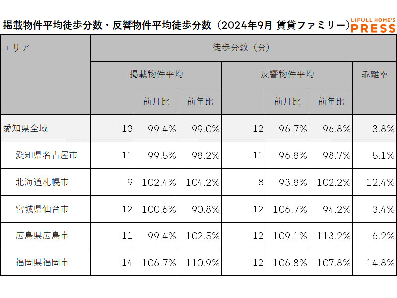 2024年9月の愛知県および地方4市(札幌市、仙台市、広島市、福岡市)のファミリー向き賃貸物件の掲載物件平均徒歩分数および反響物件平均徒歩分数は以下の通り。