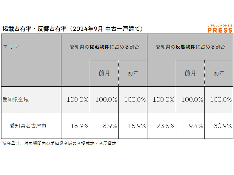 2024年9月の愛知県の中古一戸建て市場における、各エリアの掲載占有率および反響占有率は以下の通り。