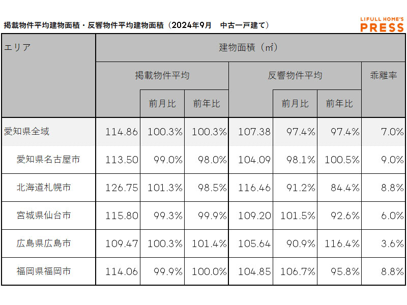 2024年9月の愛知県および地方4市(札幌市、仙台市、広島市、福岡市)の中古一戸建ての掲載物件平均建物面積および反響物件平均建物面積は以下の通り。
