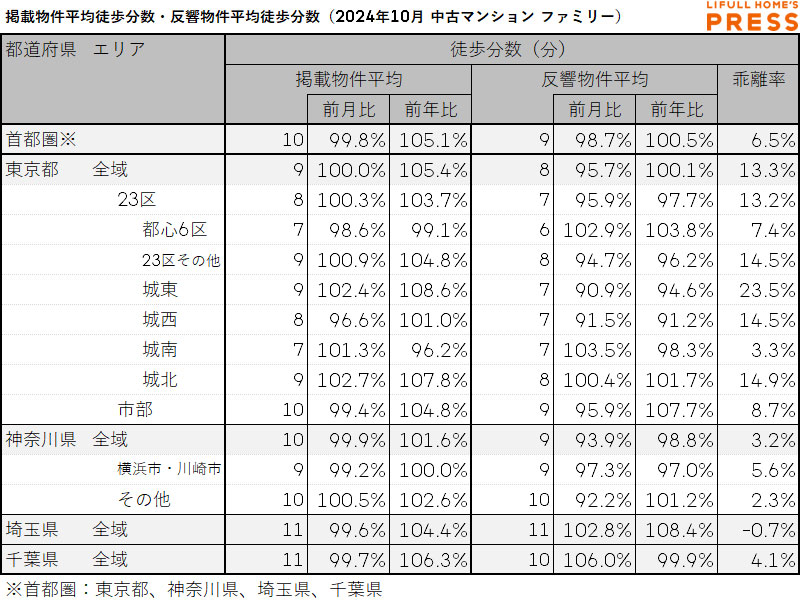 2024年10月の首都圏ファミリー向き中古マンションの掲載物件平均徒歩分数および反響物件平均徒歩分数は以下の通り。