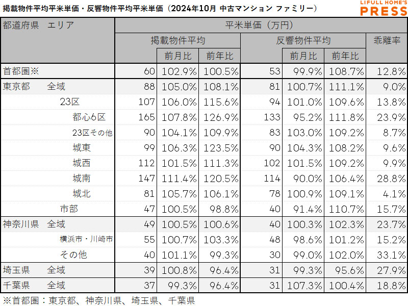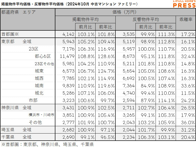 2024年10月の首都圏ファミリー向き中古マンションの掲載物件平均価格および反響物件平均価格は以下の通り。