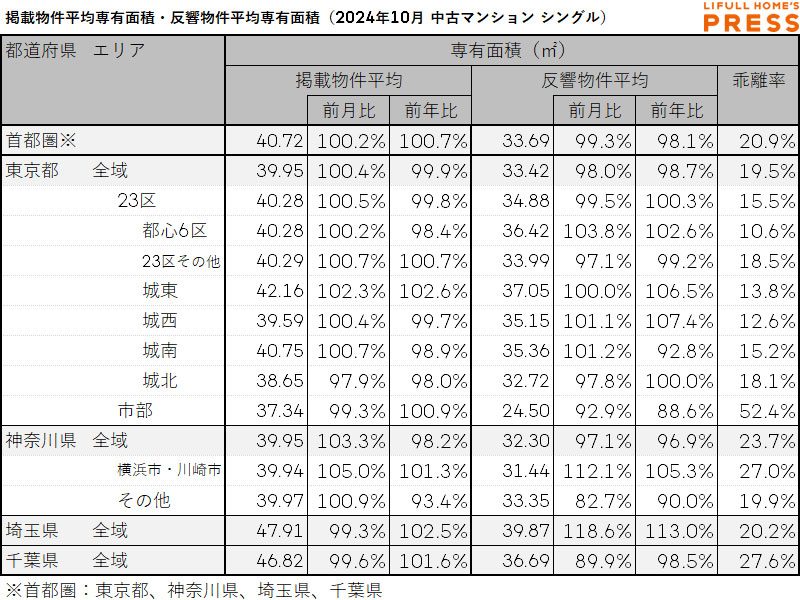 2024年10月の首都圏シングル向き中古マンションの掲載物件平均専有面積および反響物件平均専有面積は以下の通り。