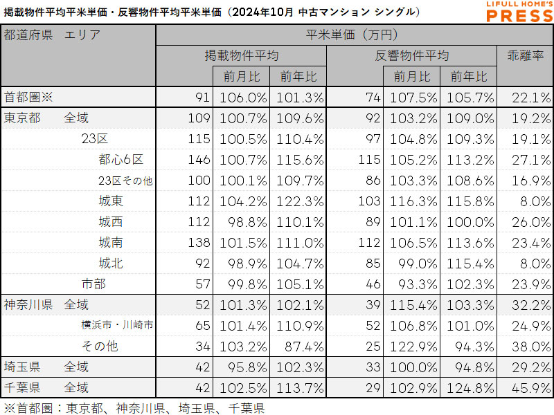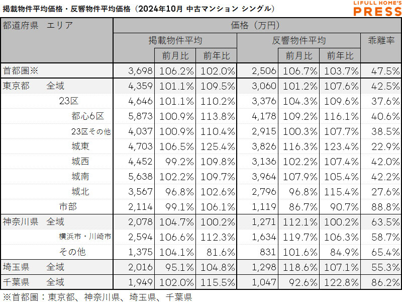 2024年10月の首都圏シングル向き中古マンションの掲載物件平均価格および反響物件平均価格は以下の通り。