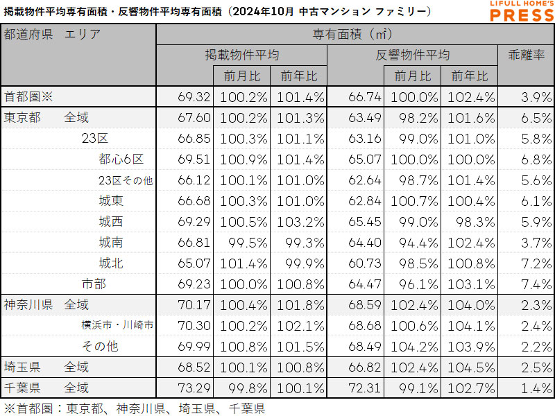 2024年10月の首都圏ファミリー向き中古マンションの掲載物件平均専有面積および反響物件平均専有面積は以下の通り。