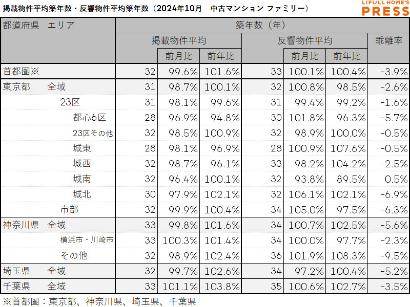 2024年10月の首都圏ファミリー向き中古マンションの掲載物件平均築年数および反響物件平均築年数は以下の通り。