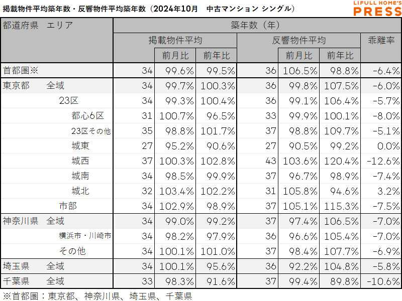 2024年10月の首都圏シングル向き中古マンションの掲載物件平均築年数および反響物件平均築年数は以下の通り。