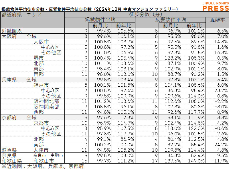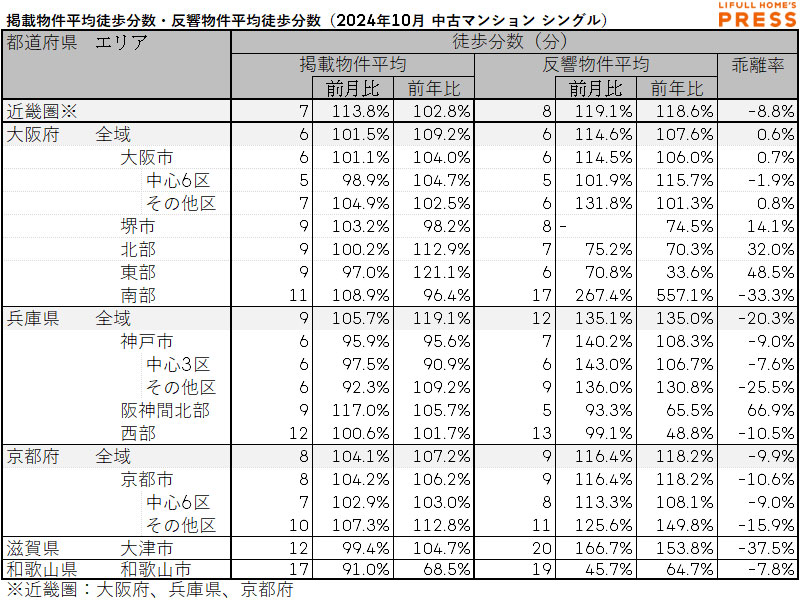 2024年10月の近畿圏ファミリー向き中古マンションの掲載物件平均徒歩分数および反響物件平均徒歩分数は以下の通り。
