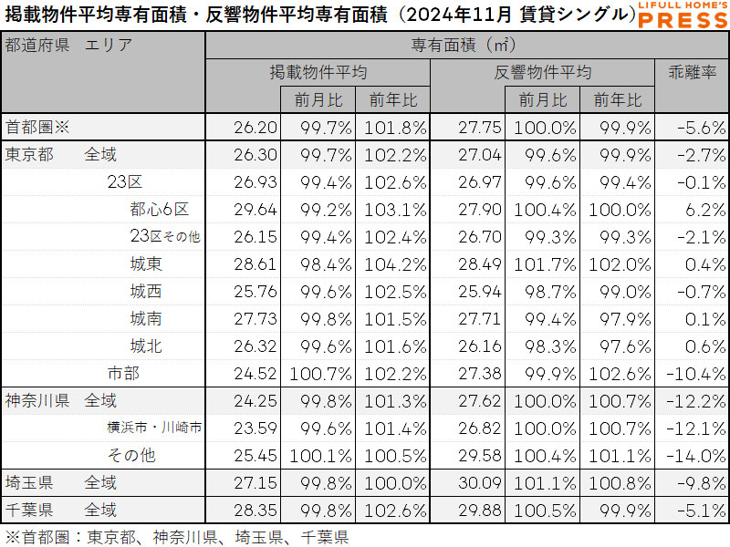 2024年11月の首都圏シングル向き賃貸物件の掲載物件平均専有面積および反響物件平均専有面積は以下の通り。