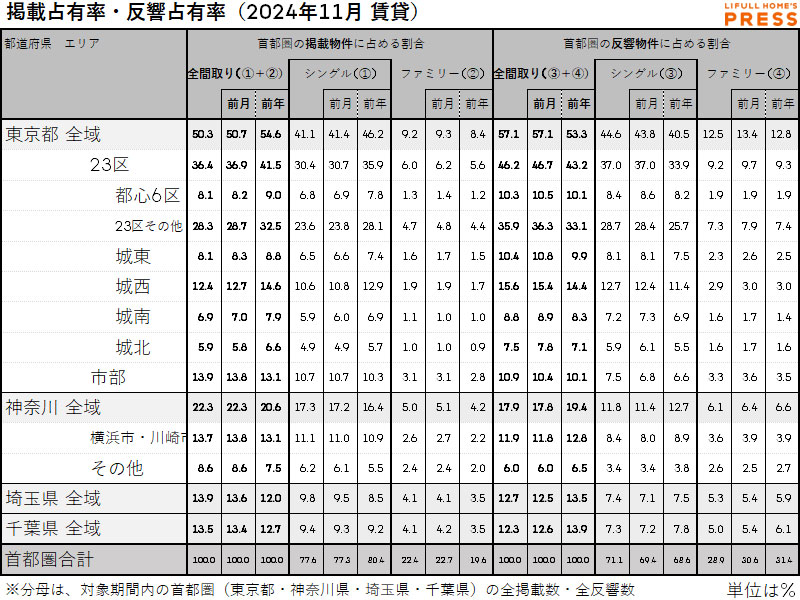 LIFULL HOME'Sマーケットレポートとは、LIFULL HOME'Sで掲載された物件データおよびユーザーがLIFULL HOME'Sを介して不動産会社に問合せた物件データをマーケットごとに公開するものである。本稿では、2024年11月に登録・公開された首都圏の賃貸物件における以下のデータをまとめた。