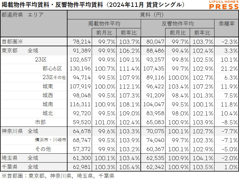 2024年11月の首都圏シングル向き賃貸物件の掲載物件平均賃料および反響物件平均賃料は以下の通り。
