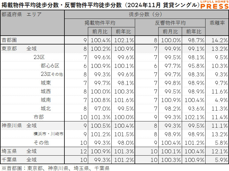2024年11月の首都圏シングル向き賃貸物件の掲載物件平均徒歩分数および反響物件平均徒歩分数は以下の通り。