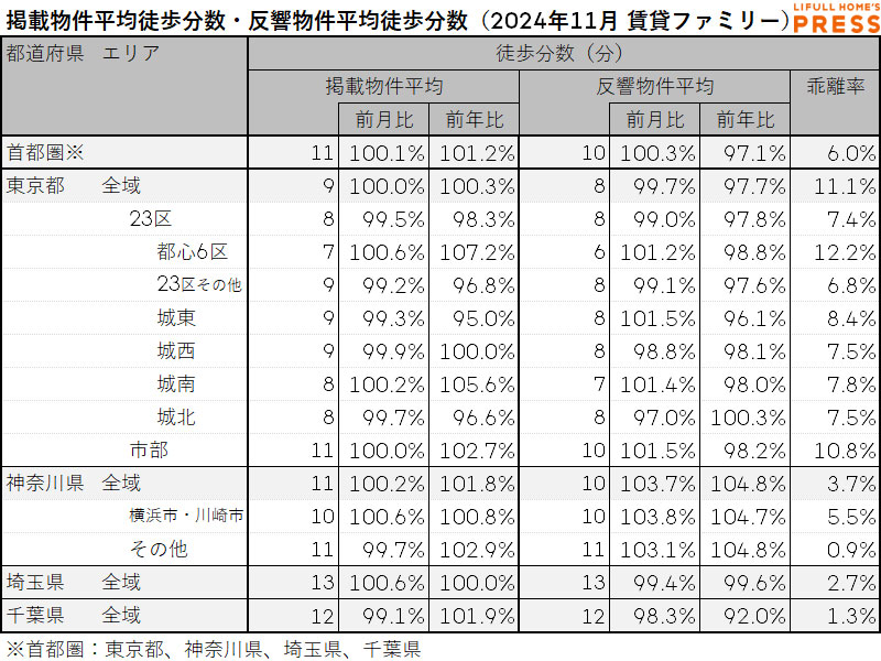 2024年11月の首都圏ファミリー向き賃貸物件の掲載物件平均徒歩分数および反響物件平均徒歩分数は以下の通り。