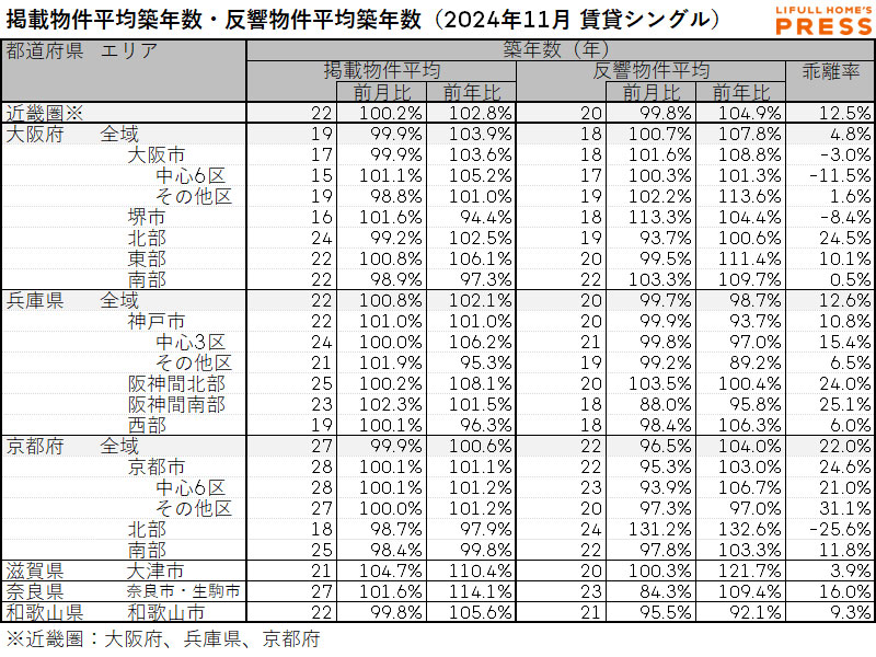 2024年11月の近畿圏シングル向き賃貸物件の掲載物件平均賃料および反響物件平均賃料は以下の通り。