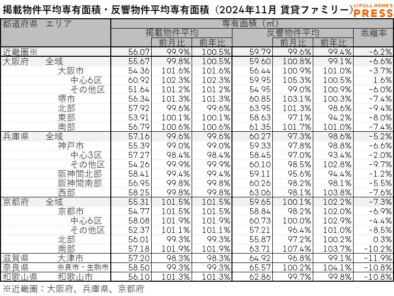 2024年11月の近畿圏ファミリー向き賃貸物件の掲載物件平均専有面積および反響物件平均専有面積は以下の通り。