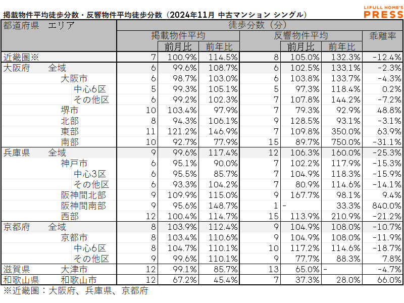 2024年11月の近畿圏シングル向き中古マンションの掲載物件平均徒歩分数および反響物件平均徒歩分数は以下の通り。