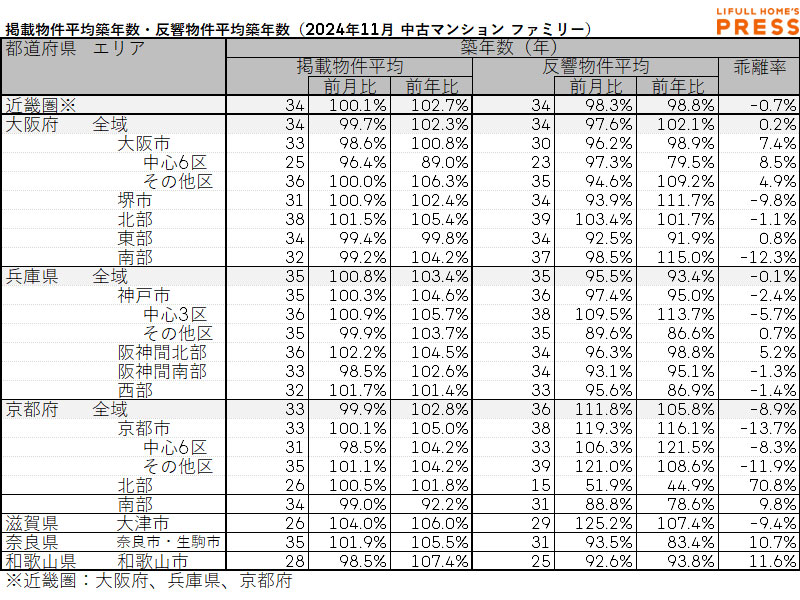 2024年11月の近畿圏ファミリー向き中古マンションの掲載物件平均築年数および反響物件平均築年数は以下の通り。