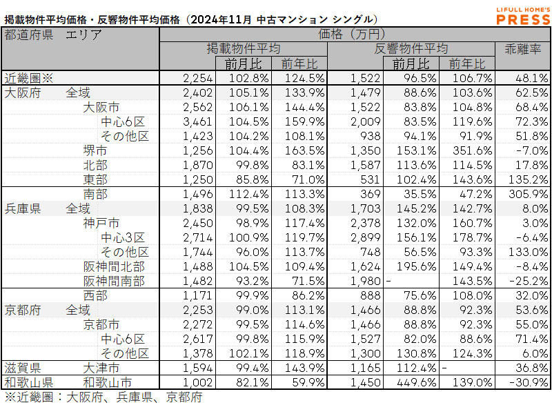 2024年11月の近畿圏シングル向き中古マンションの掲載物件平均価格および反響物件平均価格は以下の通り。