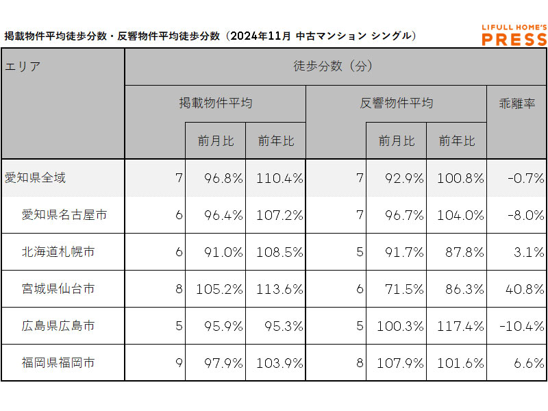 2024年11月の愛知県および地方4市(札幌市、仙台市、広島市、福岡市)のファミリー向き中古マンションの掲載物件平均徒歩分数および反響物件平均徒歩分数は以下の通り。