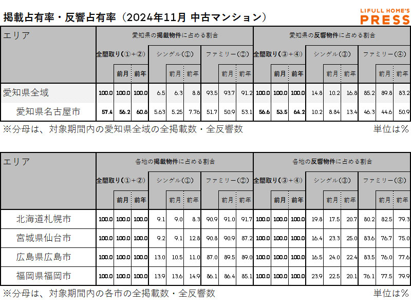 2024年11月の愛知県および地方4市(札幌市・仙台市・広島市・福岡市)中古マンション市場における、各エリアの掲載占有率および反響占有率は以下の通り。