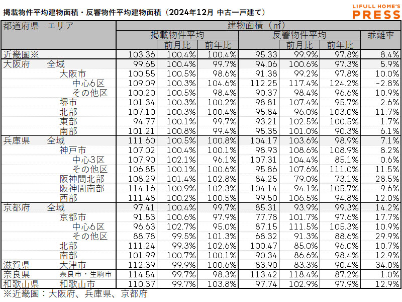 2024年12月の近畿圏中古一戸建ての掲載物件平均価格および反響物件平均価格は以下の通り。