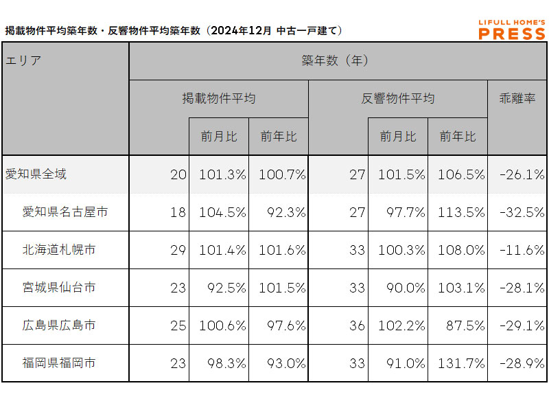 2024年12月の愛知県および地方4市(札幌市、仙台市、広島市、福岡市)の中古一戸建ての掲載物件平均築年数および反響物件平均築年数は以下の通り。