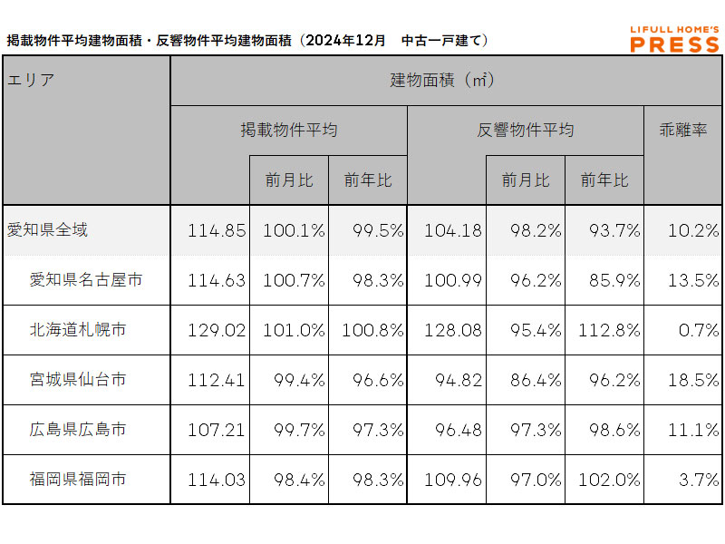 2024年12月の愛知県および地方4市(札幌市、仙台市、広島市、福岡市)の中古一戸建ての掲載物件平均建物面積および反響物件平均建物面積は以下の通り。