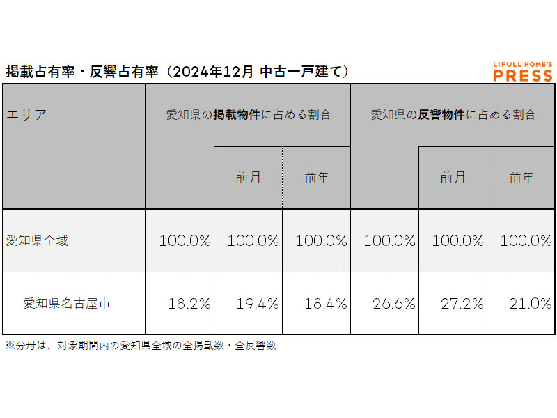 2024年12月の愛知県の中古一戸建て市場における、各エリアの掲載占有率および反響占有率は以下の通り。
