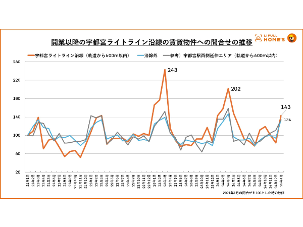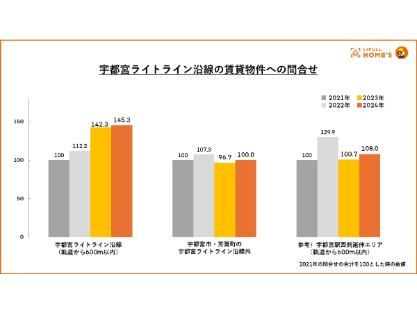 賃貸物件への問合せ数は、開業前の2021年の問合せ数を100とした場合、ライトライン沿線エリアでは、開業年の2023年は142.3、翌2024年は145.3となり、開業年以降に沿線の物件への問合せが大きく増加していることがわかった。一方、沿線外のエリアでは、2023年は96.7、2024年は100.0と伸びは見られない。なお、駅西側の延伸計画エリアでは、2023年は100.7、2024年は108.0と沿線エリアと比べると増加は限定的だった。