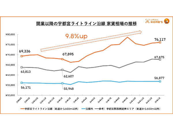 ライトライン開業以降、沿線では賃料水準にも上昇傾向がみられる。2025年1月の沿線の平均賃料は7万6,117円で開業時から+9.8%、前年同月比+12.1%となった一方、沿線外の平均賃料は5万6,877円で開業時から+1.3%、前年同月比+1.7%にとどまっている。