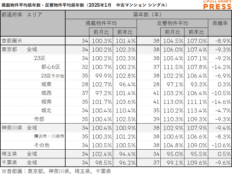 2025年1月の首都圏ファミリー向き中古マンションの掲載物件平均築年数および反響物件平均築年数は以下の通り。