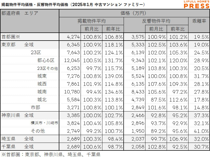 2025年1月の首都圏ファミリー向き中古マンションの掲載物件平均価格および反響物件平均価格は以下の通り。