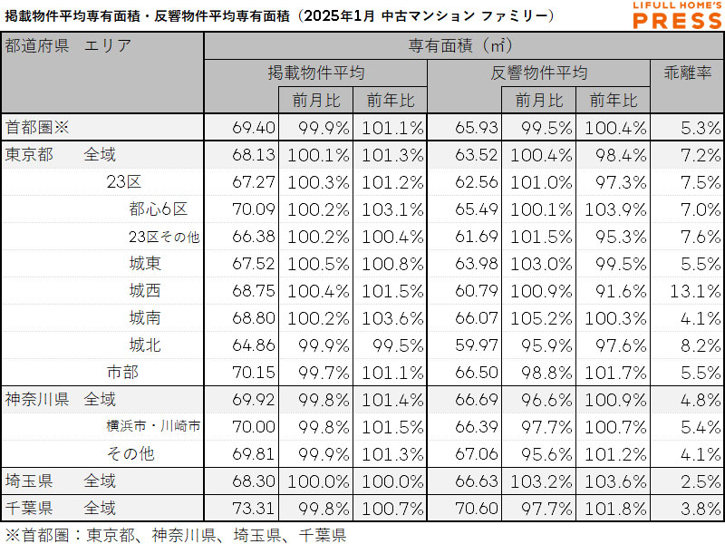 2025年1月の首都圏ファミリー向き中古マンションの掲載物件平均専有面積および反響物件平均専有面積は以下の通り。