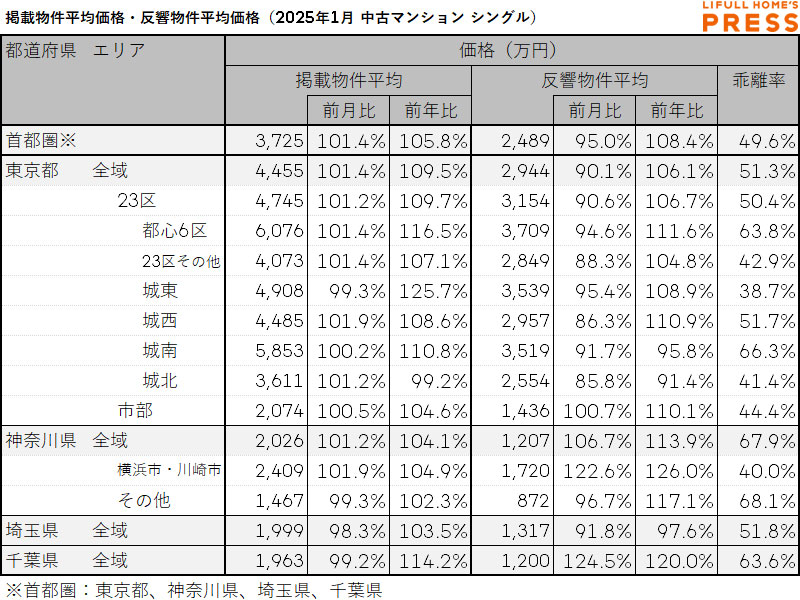 2025年1月の首都圏シングル向き中古マンションの掲載物件平均価格および反響物件平均価格は以下の通り。