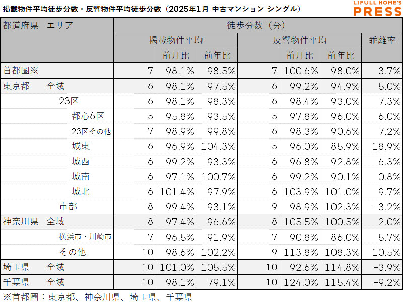 2025年1月の首都圏シングル向き中古マンションの掲載物件平均徒歩分数および反響物件平均徒歩分数は以下の通り。