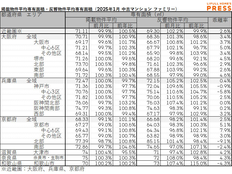 2025年1月の近畿圏ファミリー向き中古マンションの掲載物件平均専有面積および反響物件平均専有面積は以下の通り。