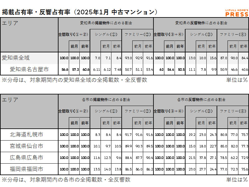 2025年1月の愛知県および地方4市(札幌市・仙台市・広島市・福岡市)中古マンション市場における、各エリアの掲載占有率および反響占有率は以下の通り。