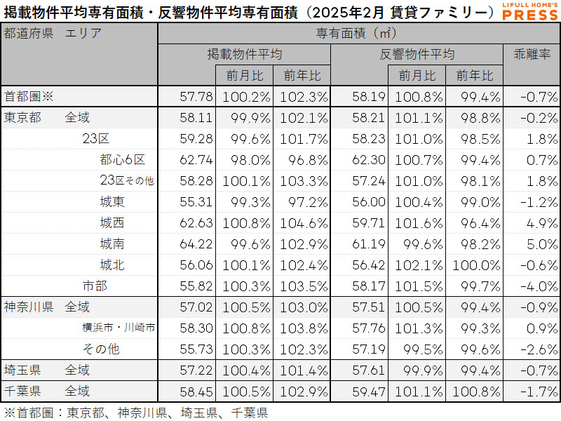 2025年2月の首都圏ファミリー向き賃貸物件の掲載物件平均賃料および反響物件平均賃料は以下の通り。