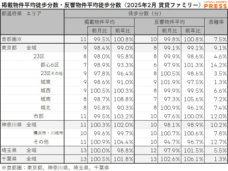 2025年2月の首都圏シングル向き賃貸物件の掲載物件平均徒歩分数および反響物件平均徒歩分数は以下の通り。