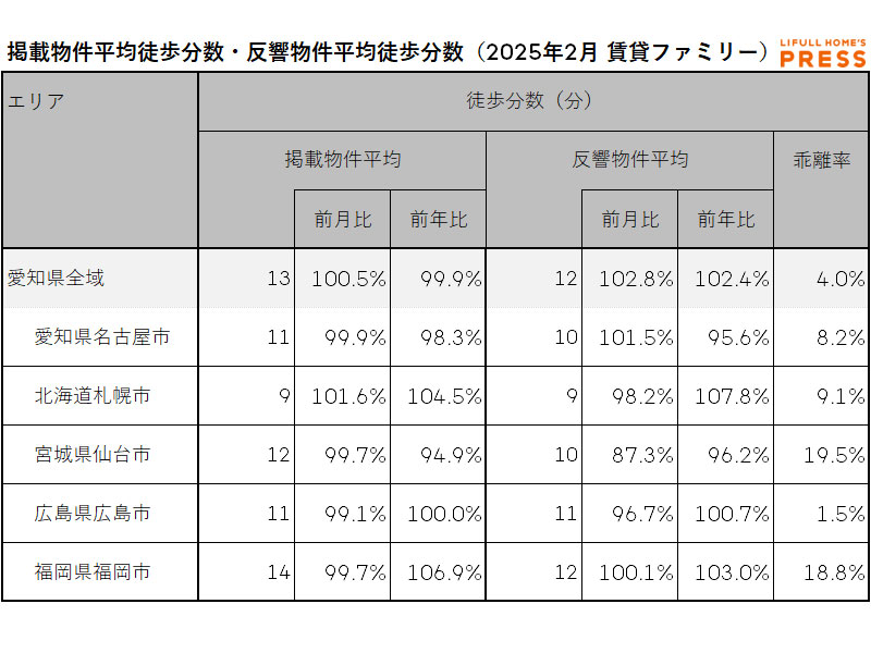 2025年2月の愛知県および地方4市(札幌市、仙台市、広島市、福岡市)のファミリー向き賃貸物件の掲載物件平均徒歩分数および反響物件平均徒歩分数は以下の通り。